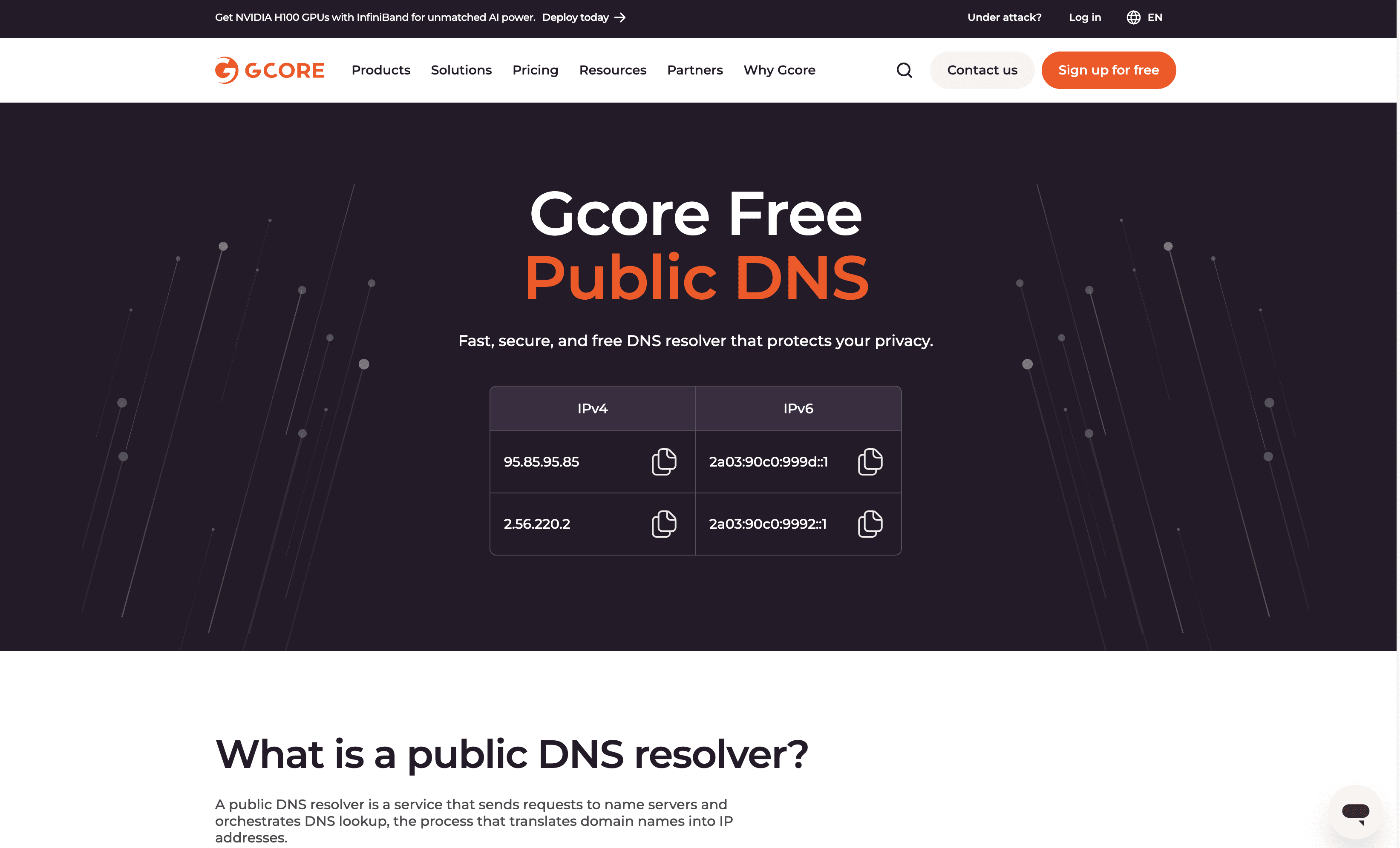 Gcore DNS is a free public DNS service designed to enhance web browsing with speed, security, and privacy. Leveraging a global network, it ensures fast DNS resolution and robust protection against online threats. Easy to configure, Gcore DNS aims to provide a seamless and secure internet experience for all users.