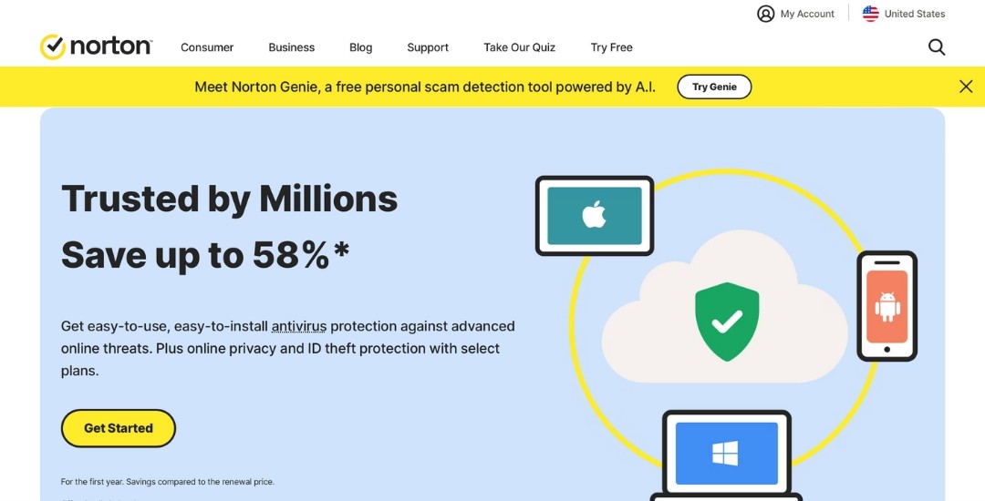 Features: Comprehensive protection with anti-malware, smart firewall, VPN, cloud storage, and identity theft protection.